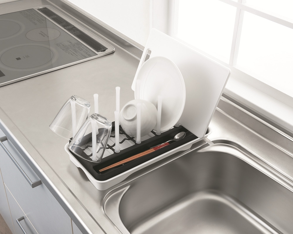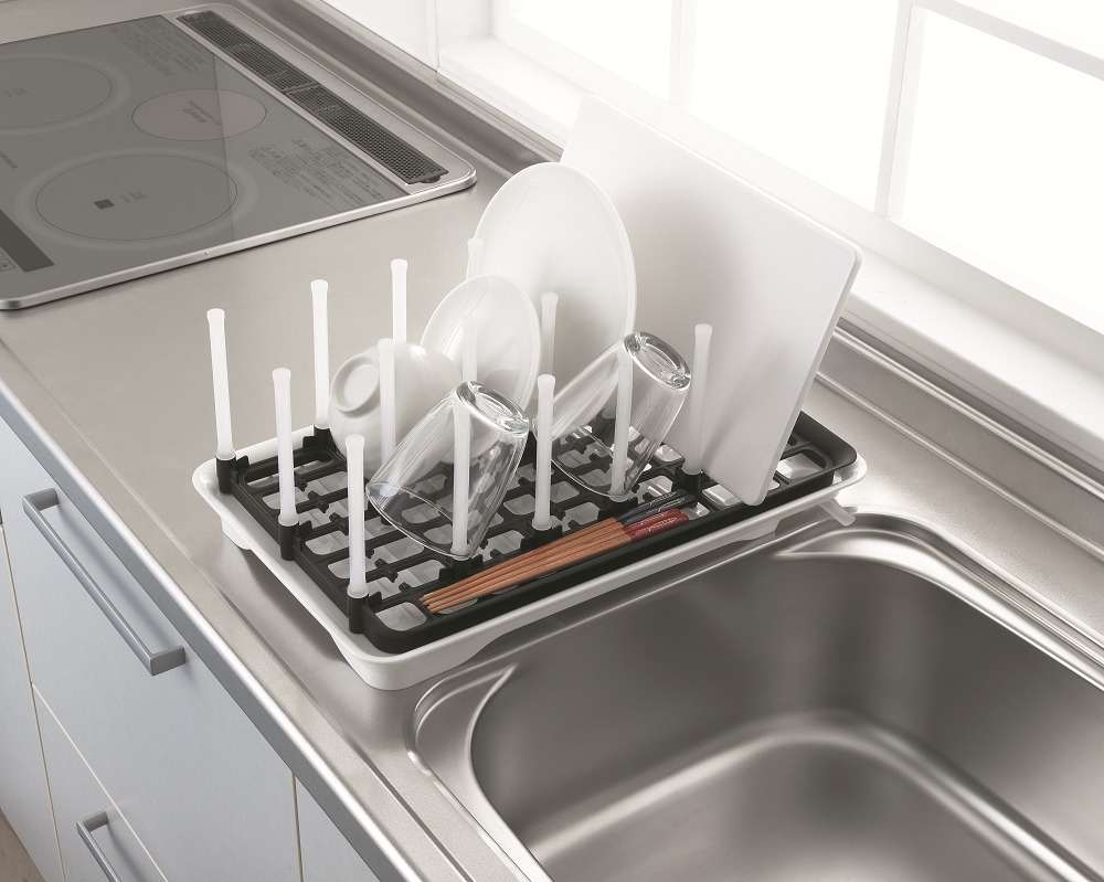 ピンにより、コップやボトルを安定して立てられきれいに水切り。